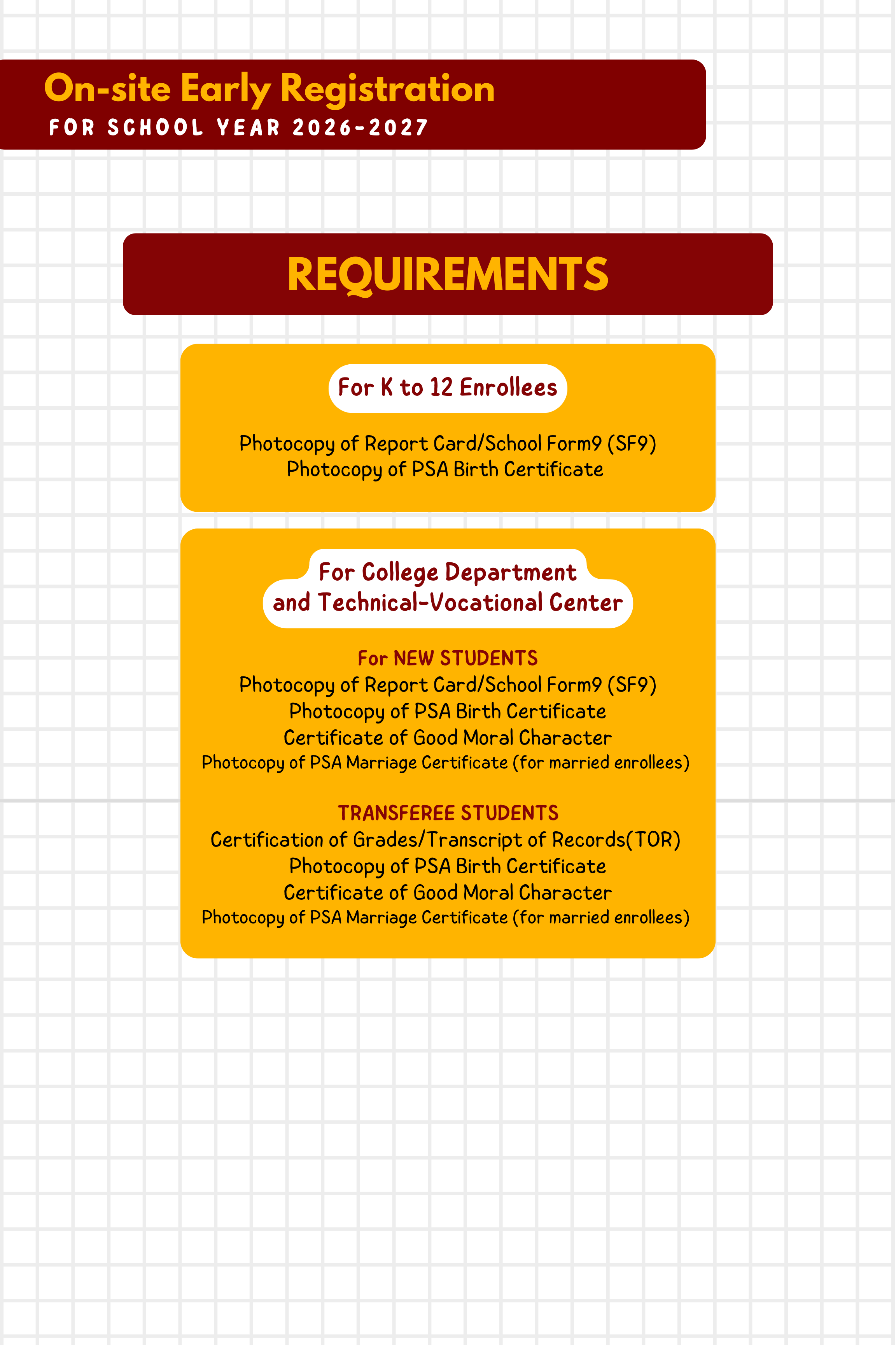 Please be advised that the EARLY REGISTRATION FOR S.Y. 2026-2027 officially OPENS on Saturday, January 17 and January 24.